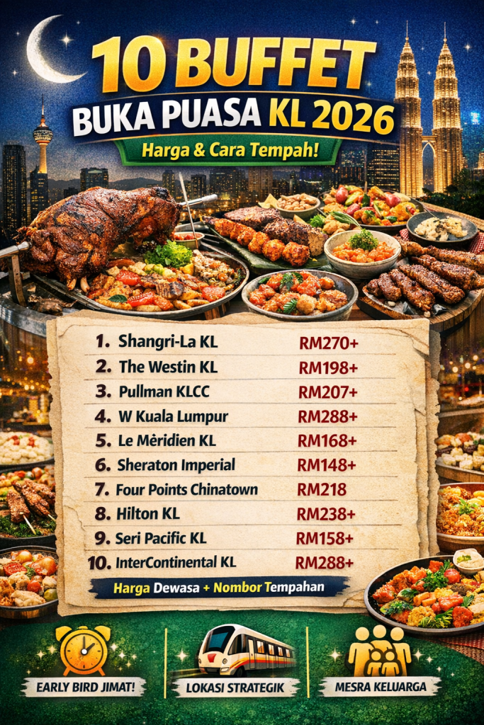 Jadi kami senaraikan 10 buffet buka puasa paling popular di Kuala Lumpur untuk 2026, lengkap dengan harga dan cara tempahan supaya senang pilih ikut bajet.
