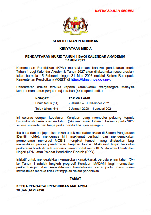 Menurut kenyataan media KPM, pendaftaran murid Tahun 1 bagi Kalendar Akademik 2027 akan dilaksanakan secara dalam talian dengan butiran berikut KM KPM Berhubung Pendaftaran Mu…: