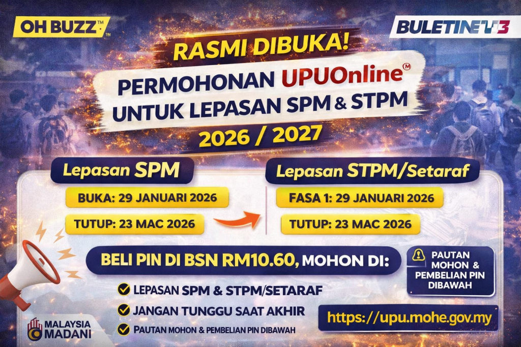 Berita penting untuk lepasan SPM, STPM dan setaraf β Permohonan UPUOnline bagi kemasukan Sesi Akademik 2026/2027 kini rasmi dibuka untuk melanjutkan pengajian ke Universiti Awam, Politeknik, Kolej Komuniti dan MARA Bahagian Pendidikan Tinggi (MARA BPT).