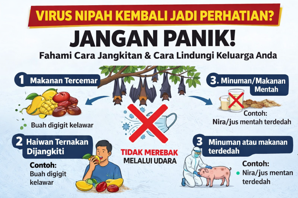 Isu Virus Nipah kembali tular di media sosial dan ramai mula risau. Tapi sebelum panik, penting untuk faham bagaimana virus ini merebak dan apa langkah pencegahan sebenar yang perlu dibuat.